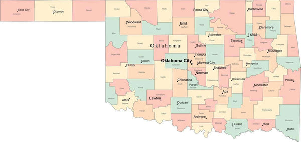 Multi Color Oklahoma Map with Counties, Capitals, and Major Cities